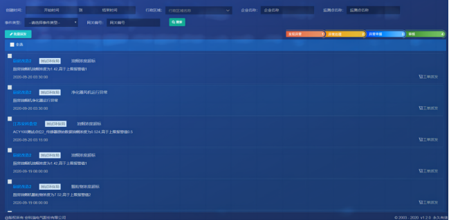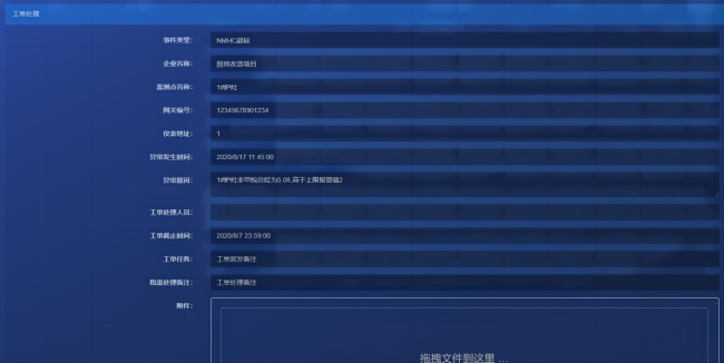 后臺根據(jù)測點設(shè)置的濃度閾值以及門限時間在隱患巡查中產(chǎn)生對應(yīng)的報警信息,并在首頁進行鈴鐺和語音提示。企業(yè)用戶對隱患進行確認,確認工單派發(fā)對象,工單截至期限,以及工單任務(wù)描述;運維人員確認工單內(nèi)容并對隱患進行處理,填寫處理結(jié)果詳情,上傳現(xiàn)場圖片等附件或進行二級派發(fā);相關(guān)企業(yè)用戶可在