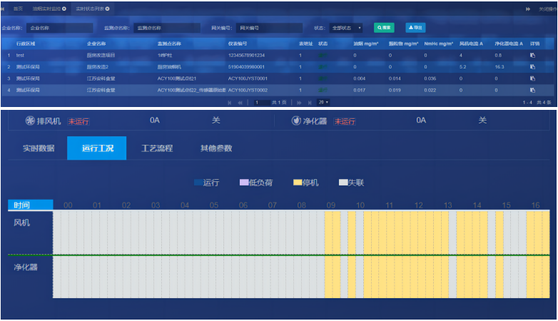 實時監(jiān)控:運行工況;實時監(jiān)測數(shù)據(jù)包括油煙凈化器和風機的運行電流,根據(jù)電流數(shù)值來判斷當前進化器的運行狀態(tài),包括失聯(lián)、停機、運行等狀態(tài),結(jié)合運行數(shù)據(jù)曲線,更加方便直觀。