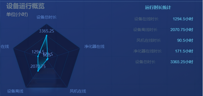 企業(yè)在線時長報告模塊,將企業(yè)目前監(jiān)測儀的在線時長,失聯(lián)時長,風機、凈化器的在線、離線時間進行匯總,以折線圖、雷達圖的形式展示。