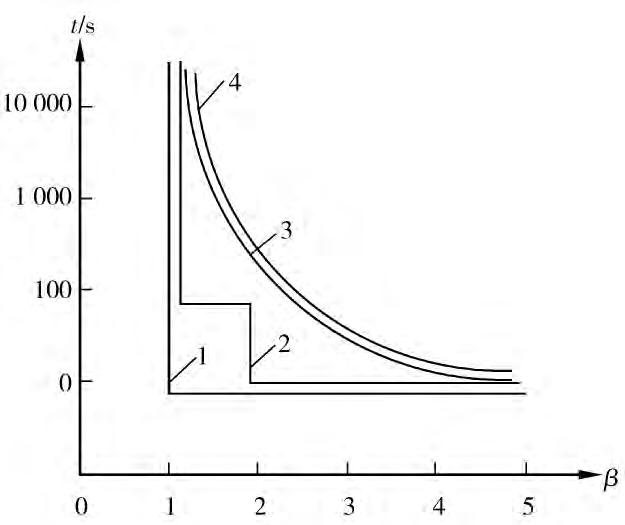 在這里,通常將電動(dòng)機(jī)過(guò)載保護(hù)特性定義為:電動(dòng)機(jī)的過(guò)載倍數(shù)與其過(guò)載保護(hù)動(dòng)作時(shí)間之間的關(guān)系。如圖3所示為電動(dòng)機(jī)的過(guò)載保護(hù)特性曲線。