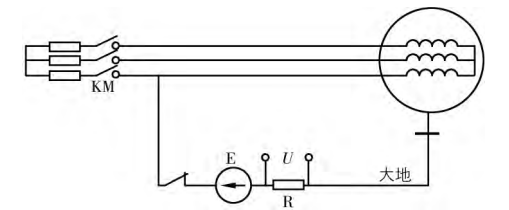 漏電閉鎖同樣是一種重要的漏電保護(hù)方法,顧名思義,漏電閉鎖是指當(dāng)檢測(cè)到線路發(fā)生漏電時(shí),需要閉鎖住電閘,防止人員送電之后因漏電而發(fā)生事故。當(dāng)三相系統(tǒng)未通電情況下,通過(guò)附加直流電源方法可以檢測(cè)到電網(wǎng)對(duì)地絕緣電阻阻值的變化,從而判斷是否發(fā)生漏電現(xiàn)象。在三相電網(wǎng)未通電情況下,如圖2所示,接觸器KM主觸點(diǎn)斷開(kāi),接觸器KM常閉觸點(diǎn)將附加直流電源接入系統(tǒng),如果發(fā)生漏電,則電壓U發(fā)生變化,從而觸發(fā)漏電保護(hù)電路動(dòng)作,達(dá)到漏電閉鎖保護(hù)的目的。