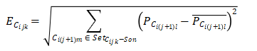 能耗指數(shù):能耗指數(shù)可以反應出能耗網(wǎng)絡中一個節(jié)點的能耗量在該節(jié)點所在等級中所占的比例,若節(jié)點Cij+1l表示節(jié)點Cijk關系子集SetCijk-Son中的一個節(jié)點,則能耗指數(shù)P的計算式為: