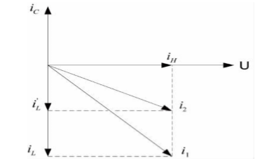 根據(jù)電路原理,電流在電感元件中作功時,電流滯后于電壓90o。而電流在電容元件中作功時,電壓滯后于電流90o。在同一電路中,電感電流與電容電流方向相反,互差180o,兩者的電流相互抵消,使電流的矢量與電壓矢量之間的夾角縮小。感性負荷的有功電流IH與電壓U同相位,假設電感和電容的合成電流為I1,無功功率為Q1,功率因數(shù)cosφ1,各相量的相位關(guān)系如下圖。