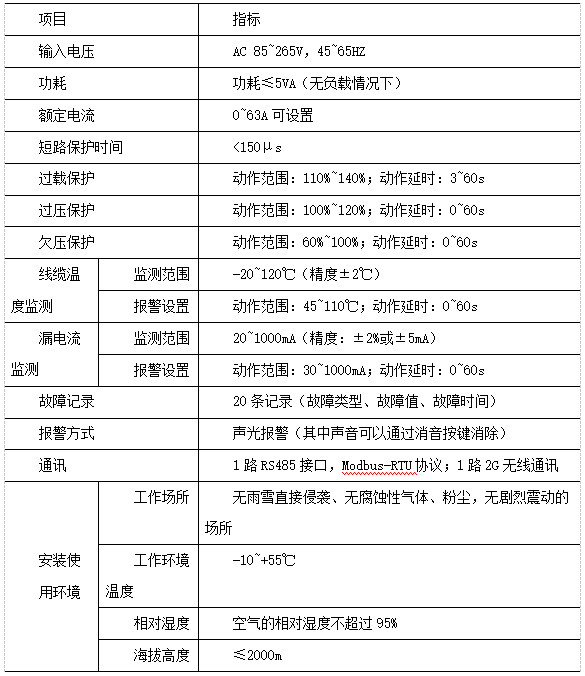 E)電纜溫度監(jiān)測功能,被測線纜溫度超過報(bào)警設(shè)定值時(shí),保護(hù)器告警或限流保護(hù)(可設(shè));