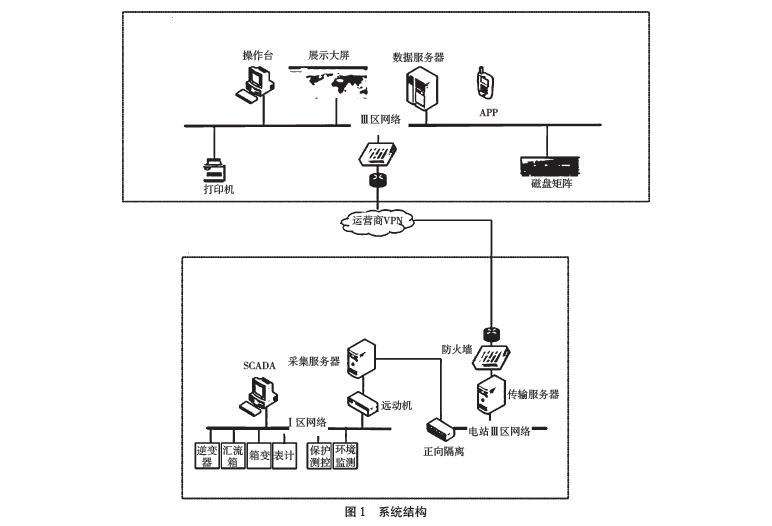 一層:總部集中管理中心層,部署大數(shù)據(jù)智能運維平臺,接收站端上傳的實時生產(chǎn)運行數(shù)據(jù)、站端主要設(shè)備的運行參數(shù)等數(shù)據(jù),對站端上傳的數(shù)據(jù)進行多層次、多維度綜合分析處理、存儲、應(yīng)用、展示及發(fā)布,評估電站生產(chǎn)運行情況,并提供生產(chǎn)運行報表;實現(xiàn)對下屬多個電站的統(tǒng)一監(jiān)視和管理。二層:站端數(shù)據(jù)采集層,建設(shè)在電站就地,通過在生產(chǎn)控制一區(qū)部署通信管理機接收電站SCADA 監(jiān)控系統(tǒng)后臺轉(zhuǎn)發(fā)的逆變器、匯流箱、升壓站遙測和電能計量表(安全Ⅱ區(qū))、環(huán)境監(jiān)測儀數(shù)據(jù),并經(jīng)過橫向隔離裝置(正向型)傳輸?shù)焦芾硇畔^(qū)的數(shù)據(jù)服務(wù)器,位于服務(wù)器中的解析程序?qū)魅氲臄?shù)據(jù)進行實時解析、入庫和統(tǒng)計分析。