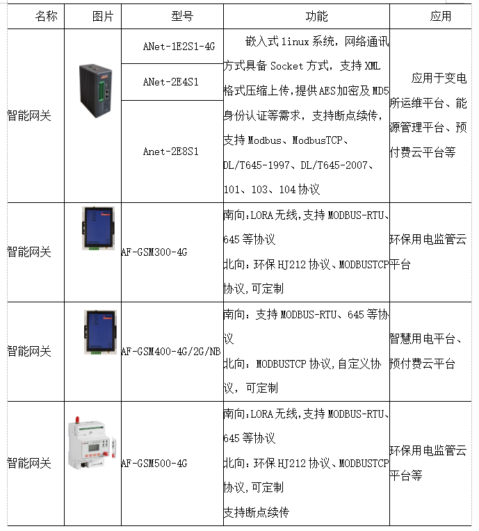 安科瑞根據(jù)多年來的項(xiàng)目經(jīng)驗(yàn),結(jié)合用戶實(shí)際需求,開發(fā)了各類有線、區(qū)域無線、廣域無線通訊產(chǎn)品,包括網(wǎng)關(guān)和終端設(shè)備。支持RS485、以太網(wǎng)、LORA、ZigBee、GPRS、4G、NB-IOT等多種通訊方式,隨著5G建設(shè)步伐的加快,未來將會(huì)有越來越多的通訊方式融入產(chǎn)品,服務(wù)于泛在電力物聯(lián)網(wǎng)建設(shè)。