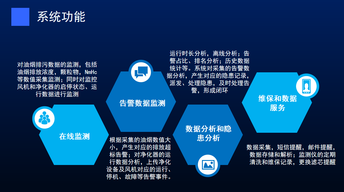 | 監(jiān)測因子 | 監(jiān)測因子 | 可實(shí)時(shí)監(jiān)測油煙濃度、顆粒物濃度、非甲烷總烴濃度、傳感器連接狀態(tài)、風(fēng)機(jī)及凈化器的電流及工作狀態(tài) |