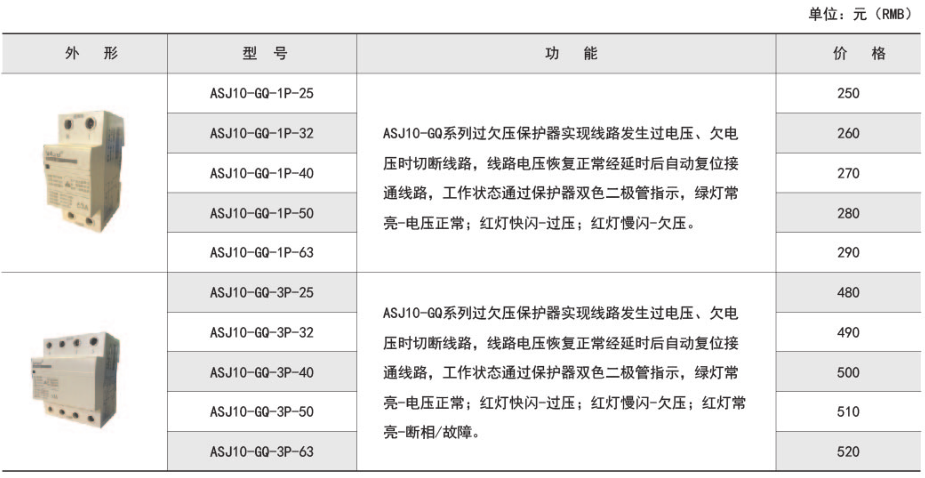 ASJ10-GQ系列自復(fù)式過(guò)欠壓保護(hù)器(以下簡(jiǎn)稱(chēng)ASJ),適用于單相交流電壓230V或三相電壓400V,頻率50Hz,額定工作電流至63A及以下的用戶(hù)或負(fù)載。由中性線(xiàn)故障引起的單相或三相線(xiàn)路過(guò)、欠電壓時(shí),保護(hù)器對(duì)用電設(shè)備進(jìn)行保護(hù)。