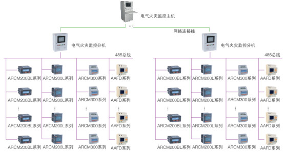 Acrel-6000電氣火災(zāi)監(jiān)控系統(tǒng)采用Acrel-6000/Q電氣火災(zāi)監(jiān)控設(shè)備(主機)+Acrel-6000/B電氣火災(zāi)監(jiān)控設(shè)備(分機)+電氣火災(zāi)監(jiān)控探測器三層結(jié)構(gòu)組網(wǎng)模式,適用范圍比較廣,滿足各種環(huán)境的現(xiàn)場,便于區(qū)域化管理,探測器與監(jiān)控設(shè)備之間采用RS-485通訊,監(jiān)控設(shè)備與分機之間采用以太網(wǎng)通訊,滿足了通訊實時性高的要求。