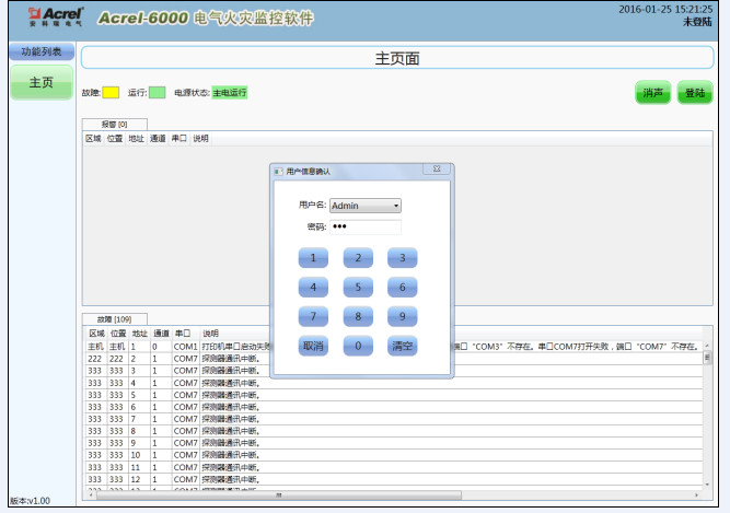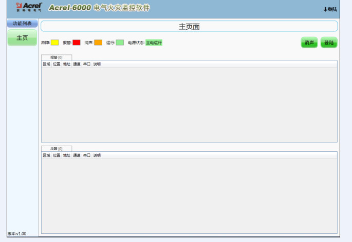 包含“登陸”、“消音”、“運行監(jiān)視界面” 及“系統(tǒng)狀態(tài)欄”四部分,可以分別通過點擊系統(tǒng)主界面上方的菜單欄或快速啟動欄內(nèi)按鈕進(jìn)入各相關(guān)功能界面。