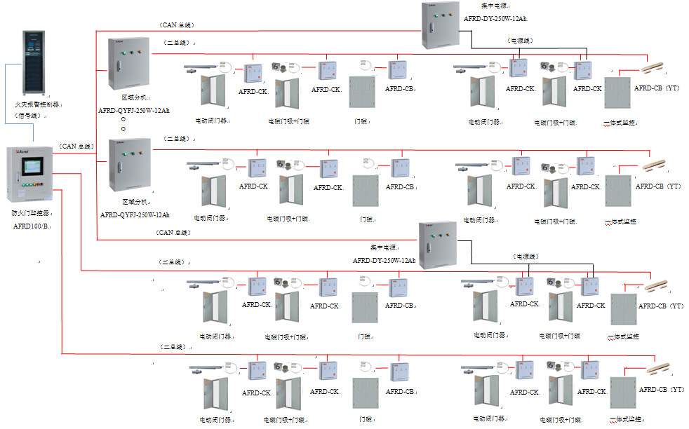 AFRD100防火門監(jiān)控系統(tǒng)采用AFPM100/B防火門監(jiān)控器(主機(jī))+區(qū)域分機(jī)+防火門監(jiān)控模塊三層結(jié)構(gòu)組網(wǎng)模式,適用范圍廣,滿足各種環(huán)境的現(xiàn)場,便于區(qū)域化管理,監(jiān)控模塊與監(jiān)控器之間采用二總線通訊,監(jiān)控器與分機(jī)之間采用CAN總線通訊,滿足了通訊實(shí)時(shí)性高的要求。
