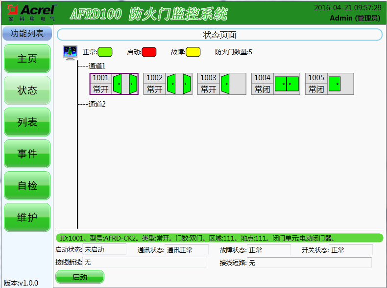 該界面以圖形化顯示方式直觀的展現(xiàn)了被監(jiān)測的防火門的工作狀態(tài),點(diǎn)擊防火門圖標(biāo)后,系統(tǒng)會顯示該防火門的詳細(xì)信息。