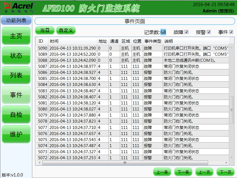 該界面可顯示當(dāng)前存儲的報(bào)警記錄、故障記錄和事件記錄,可選擇查詢當(dāng)天記錄也可以自定義查詢?nèi)掌凇?/div>
