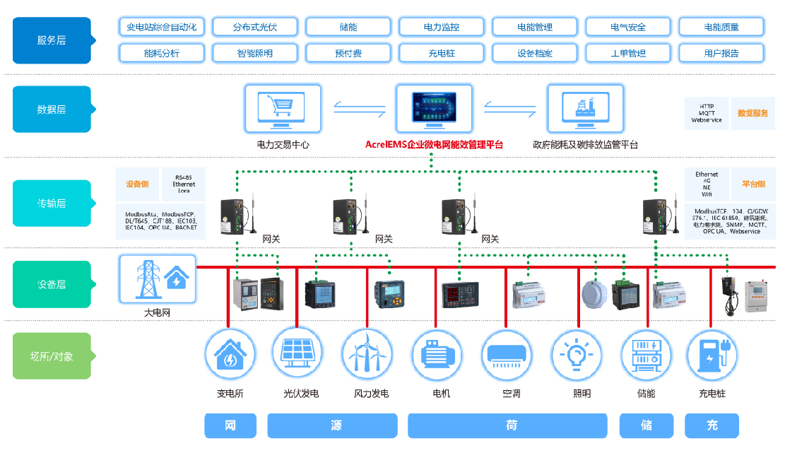 在企業(yè)微電網(wǎng)源、網(wǎng)、荷、儲、充的各個關(guān)鍵節(jié)點安裝計量和分析裝置,搭建三級計量體系,用于監(jiān)測企業(yè)能耗總量和能耗強度,從而診斷低能效環(huán)節(jié)。平臺根據(jù)最新的電網(wǎng)價格、用電負荷、電網(wǎng)調(diào)度指令等情況,調(diào)整能源使用策略,優(yōu)先使用綠色能源,使企業(yè)微電網(wǎng)始終高效穩(wěn)定運行,快速響應(yīng)電網(wǎng)需求,實現(xiàn)能源互聯(lián)、信息互動,也可以把數(shù)據(jù)上傳政府能源管控平臺,例如發(fā)改委、工信部、住建部門重點用能單位能耗在線監(jiān)測平臺、電力需求側(cè)平臺、建筑能耗監(jiān)測平臺等。