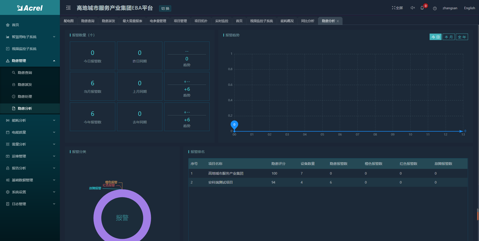 系統(tǒng)在產(chǎn)生報(bào)警或隱患后,系統(tǒng)可以針對(duì)工程人員派發(fā)工單,處理完以后工程人員能夠在系統(tǒng)中填寫(xiě)相關(guān)工單任務(wù)記錄,以供歷史查詢(xún)。隱患統(tǒng)計(jì)支持對(duì)項(xiàng)目進(jìn)行日、月、季、年的維度查詢(xún),并能夠自定義時(shí)間查詢(xún),將項(xiàng)目下隱患以曲線(xiàn),圖表的形式展現(xiàn)。