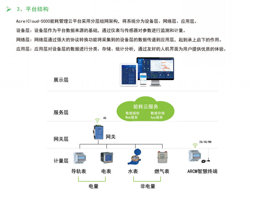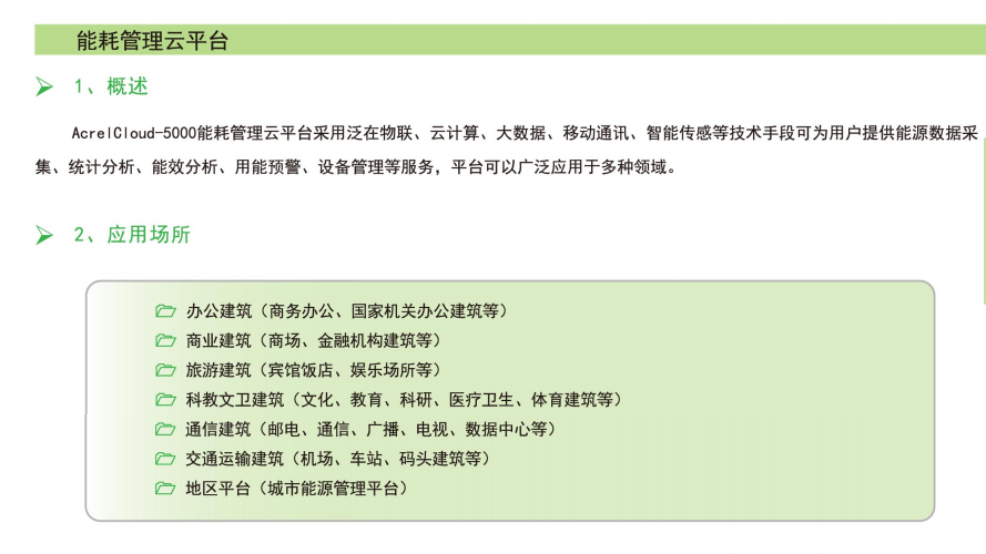 AcrelCloud-5000能耗管理云平臺采用泛在物聯(lián)、云計算、大數(shù)據(jù)、移動通訊、智能傳感等技術(shù)手段可為用戶提供能源數(shù)據(jù)采集、統(tǒng)計分析、能效分析、用能預(yù)警、設(shè)備管理等服務(wù),平臺可以廣泛應(yīng)用于多種領(lǐng)域