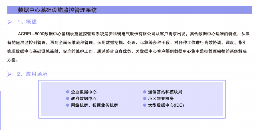 Acrel-8000數(shù)據(jù)中心基礎(chǔ)設(shè)施監(jiān)控管理系統(tǒng)是安科瑞電氣股份有限公司從客戶需求出發(fā),集合數(shù)據(jù)中心運(yùn)營(yíng)的特點(diǎn),從設(shè)備的底層監(jiān)控到管理,再到全面運(yùn)營(yíng)流程管理,運(yùn)用數(shù)據(jù)挖掘、處理、運(yùn)算等多種手段,對(duì)各種工作進(jìn)行高效協(xié)調(diào)、調(diào)度、指引實(shí)現(xiàn)數(shù)據(jù)中心基礎(chǔ)設(shè)施高效、安全的維護(hù)工作。通過(guò)整合自身優(yōu)勢(shì),為數(shù)據(jù)中心客戶提供數(shù)據(jù)中心集中監(jiān)控管理完整的